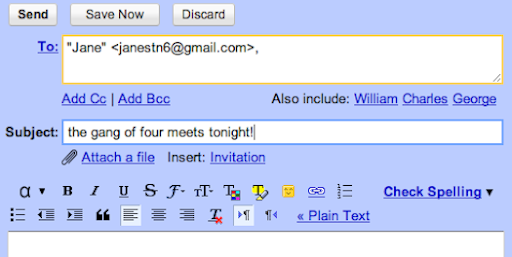 Nous avons reçu énormément de retours positifs pour ces deux fonctionnalités, et aujourd’hui nous sommes ravis de sortir ces fonctions des Labs pour les offrir à tout le monde par défaut (elles devraient commencer à faire leur apparition dans tous les comptes Gmail au cours des prochains jours). Grâce à ces fonctionnalités, alors que vous saisissez les adresses de vos destinataires, Gmail vous fera automatiquement des suggestions basées sur les groupes de personnes auxquelles vous écrivez le plus. Lorsqu’une telle suggestion apparaît, il vous suffit de cliquer dessus pour ajouter le destinataire à la liste, ou remplacer l’adresse email erronée.