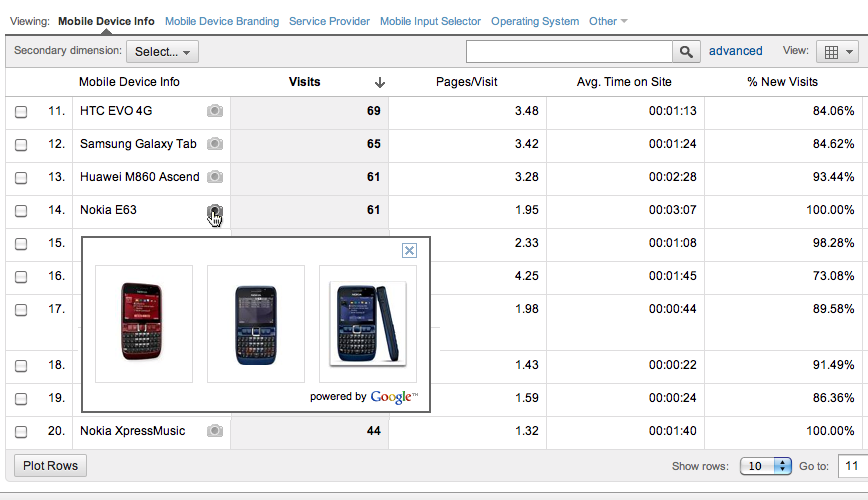 Les informations sur les mobiles renseignent sur les appareils. L’un des avantages de ce rapport est que vous pouvez afficher une photo de n’importe quel appareil. Vous avez sans doute déjà vu un iPhone en vrai, et avez vraisemblablement une idée du rendu de votre site sur cet appareil, mais ce n’est sans doute pas le cas pour des téléphones moins communs comme le Nokia E63. Cliquez sur l’icône en forme d’appareil photo à côté de chaque appareil pour en voir des photos.