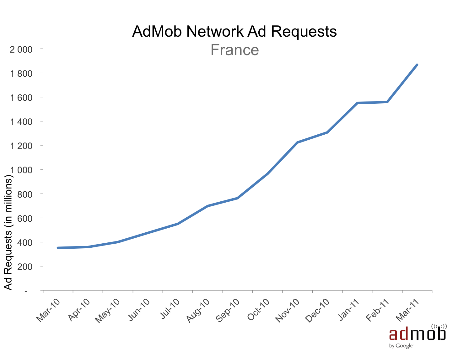 Nos recherches ont montré que 27% des adultes français utilisent un smartphone, et 59% d’entre eux se connectent à Internet quotidiennement, ce qui constitue le plus fort taux de connexion en Europe. Résultat de cet usage actif de l’Internet mobile, les utilisateurs français de smartphones recherchent également plus que leurs concitoyens européens : 73% d’entre eux déclarent avoir déjà utilisé un moteur de recherche. Les données provenant de notre réseau publicitaire AdMob montrent aussi que les utilisateurs français sont parmi les plus actifs : le traffic mobile français est 6 fois plus important qu’il y a un an, et nous recevons 1,7 milliards de requêtes par mois. Comme dans les autres pays européens, cette impressionnante croissance est majoritairement poussée par l’adoption des smartphones.