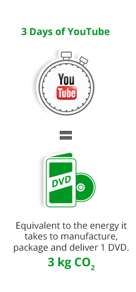 Nous avons mené une étude similaire pour YouTube, et les résultats sont encore plus probants : les serveurs nécessaires pour regarder une minute de vidéo YouTube consomment environ 0.0002 KWh. Pour vous donner une idée, il faut à peu près 8 secondes à un corps humain pour consommer cette même quantité d’énergie. Vous devriez regarder YouTube pendant 3 jours d’affilé pour que nos serveurs consomment autant d’énergie que les processus de fabrication, d’emballage et de transport d’un seul DVD.