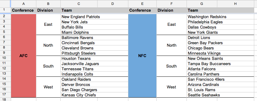 Après avoir appliqué ces fusions verticales à toutes les conférences et divisions, ainsi que ces fusions horizontales aux noms des équipes, de chaque conférence, vous êtes prêt pour partager la feuille de calcul avec vos amis pour lancer le tournoi!