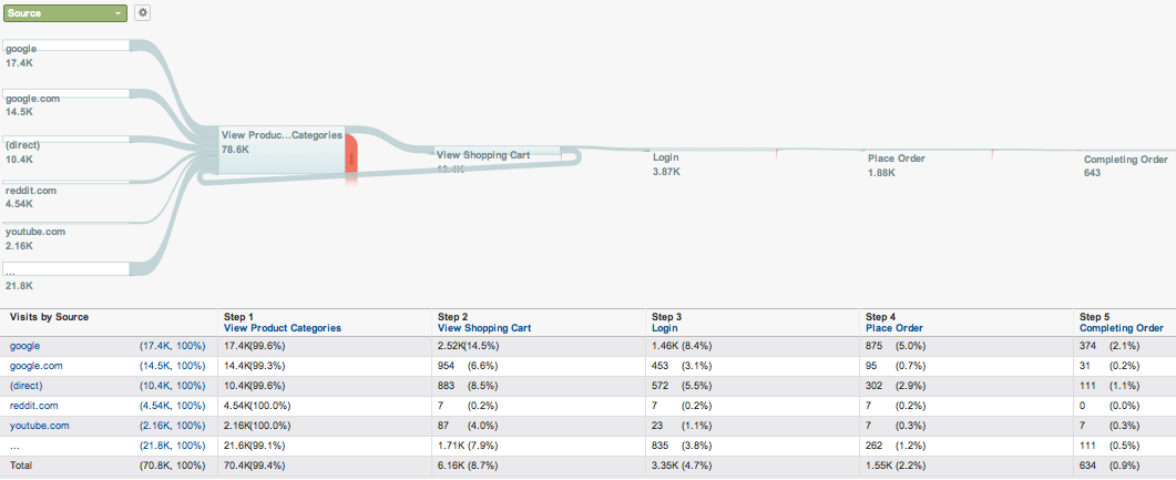 Ce type de visualisation vous permet d’apporter des réponses à d’importes questions, comme “est-ce que ma nouvelle page de promo est performante ?“. Dans l’exemple ci-dessus, vous savez immédiatement qu’il y a 5460 visites (basées sur les sources à gauche), et que la majorité de ces visites proviennent de Google.