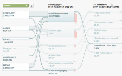 Ce matin lors du Web 2.0 Summit, Susan Wojcicki et moi-même avons dévoilé la “Visualisation des flux” dans Google Analytics, un outil qui vous permet d’analyser et de comprendre instantanément comment vos visiteurs parcourent les pages de votre site. A partir de cette semaine, les rapports “Flux de visiteurs” et “Flux des objectifs” seront déployés sur l’ensemble des comptes Google Analytics au cours des mois à venir. Pour patienter, voici à quoi vous pouvez attendre :