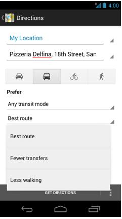 Google Maps 6.5 pour Android vous permet désormais de privilégier un mode de transport en commun (comme le bus ou le métro) et votre option d’itinéraire préférée (prendre l’itinéraire recommandé, celui avec le moins de transferts ou celui avec le moins de marche à pied). Que vous ayez besoin d’aller rapidement quelque part, que vous vouliez éviter de manquer une correspondance manquée ou si vous préférez ne pas fatiguer vos jambes, vous pouvez obtenir les itinéraires qui vous conviennent le mieux. Les itinéraires de transit et les horaires des transports en commun sont disponibles pour 475 villes à travers le monde.