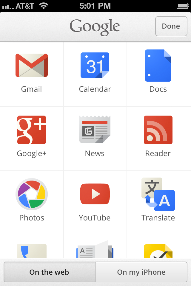 Nous avons rassemblé l’ensemble de vos services Google favoris à un seul et même endroit. Vous pouvez choisir de parcourir toutes les applis Google, ou de ne voir que celles que vous avez installé. Connectez-vous à votre compte Google, et vous n’aurez plus jamais besoin de vous reconnecter pour consulter un email, mettre à jour votre agenda, ou voir ce qui fait le buzz sur Google+.