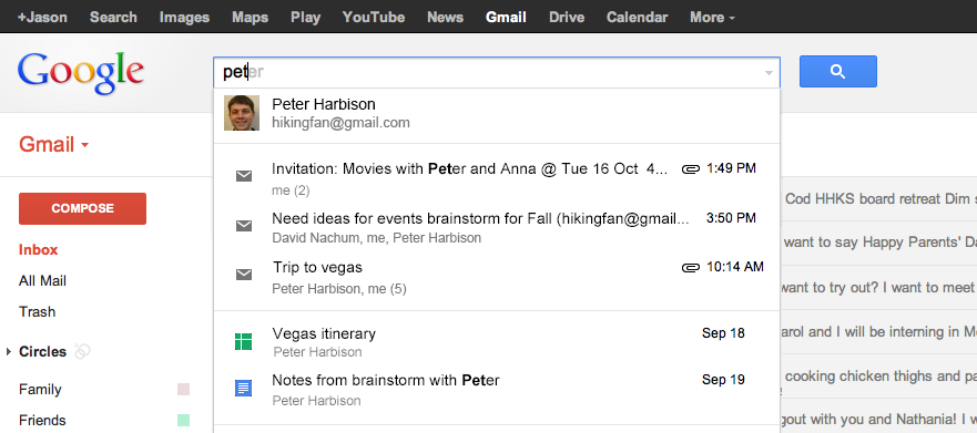 Dans Gmail, commencez à saisir votre requête et vous verrez instantanément dans les suggestions les emails pertinents ainsi que les documents Drive, les évènements Google Agenda, et plus.