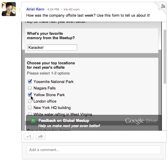 - Partage : Si vous partagez un formulaire sur Google+, quiconque se trouvant dans vos cercles peut y répondre sans quitter son flux d’actu. Et si vous envoyez un formulaire par email, les destinataires peuvent y répondre sans quitter Gmail.