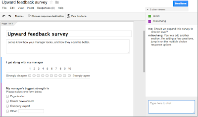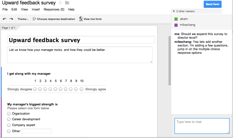 Comme pour les documents, les feuilles de calcul et les présentations, vous pouvez désormais collaborer en temps réel avec d’autres personnes. Si vous devez travailler avec deux collègues sur un sondage, vous pouvez travailler tous les trois sur le même formulaire simultanément et même démarrer une conversation au sein de l’outil.